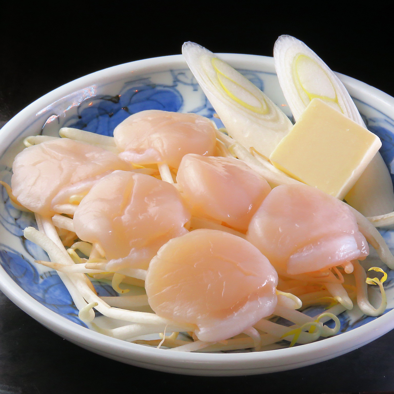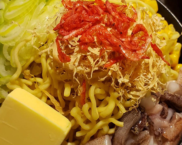 生イカ、タコ、ホタテ、エビ、豚バラの5品目の具材が載ったもんじゃ。海鮮の出汁が出まくってます!!